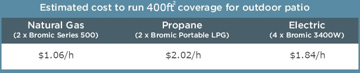 Running costs will vary per model and power output (wattage for electric and BTU for gas). In general, natural gas tends to be the cheapest way to heat a patio, followed by electric and then propane. Below is an estimate on how much it would cost to heat a 400ft2 patio with Bromic’s range of patio heaters.