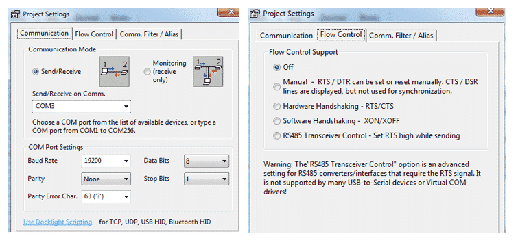 - Software installed on the PC to read and send RS 232 in hexadecimal codes, such as Docklight©