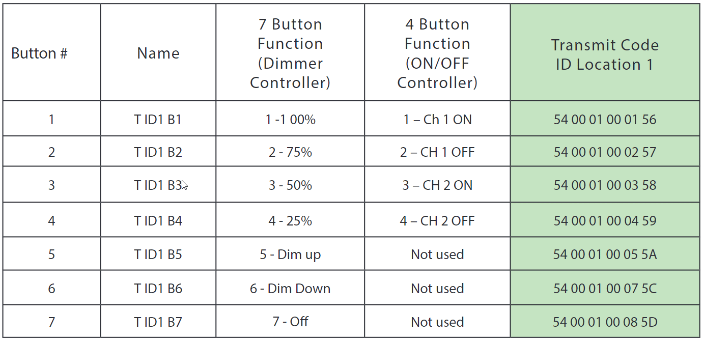 Step 3 – Enter the Transmit code for Button 1 (Shown in Green on above table).