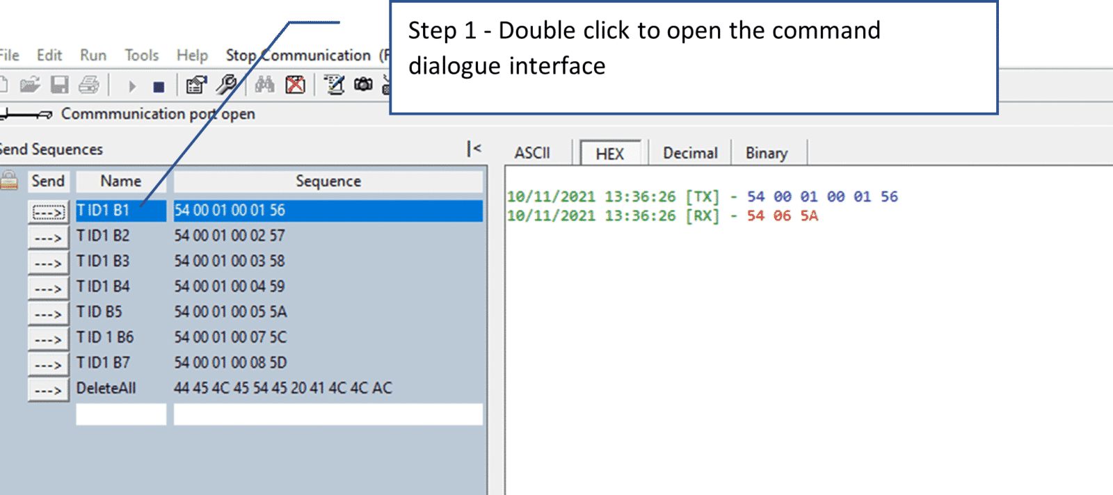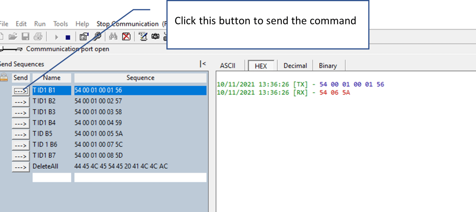 Step 3 – The command line interface window will show the transmit code in blue and receive response ‘54 06 5A’.