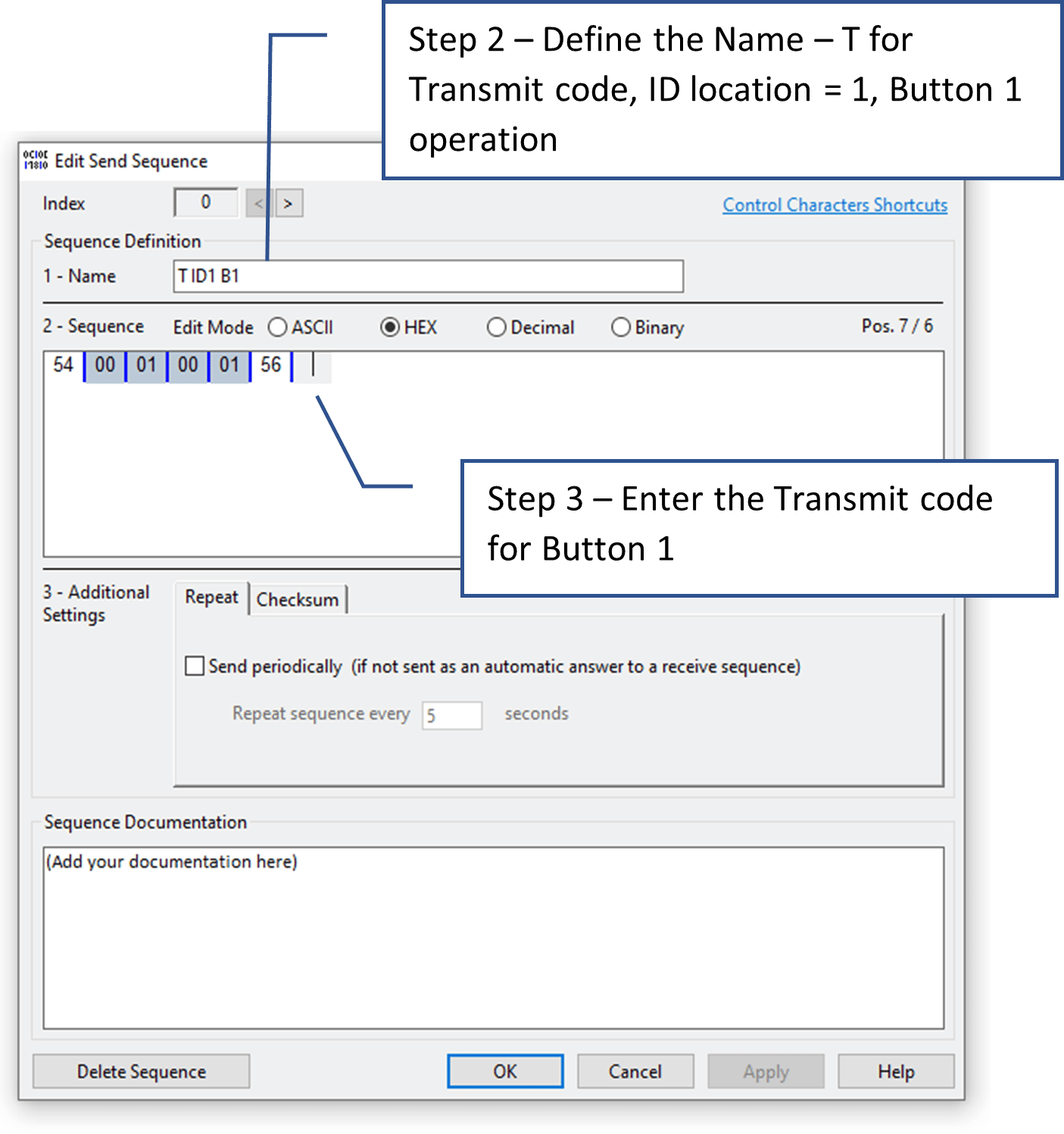 Step 2 – Define the Name – T for Transmit code, ID Location = 1, Button 1 operator.