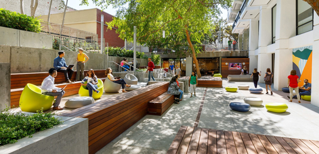 These same shared spaces can be inside the office or outdoors. This evolution reflects a deeper understanding of the modern workforce’s needs, emphasizing flexibility, connectivity, and the creation of environments that nurture both individual productivity and collective creativity. Ensuring the well-being of employees and incorporating ergonomic considerations in these environments poses another opportunity, necessitating thoughtful design strategies that prioritize comfort and health-conscious workspaces.