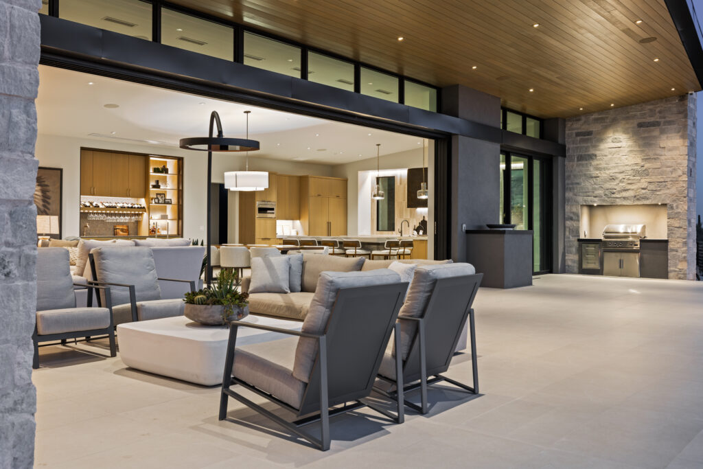 Bradley Leavitt, founder of AFT Construction, highlights the aim of integrating the outdoors into the living experience, catering to the clients’ penchant for outdoor living and entertainment. The design centers around creating expansive living areas both indoors and outdoors, offering breathtaking views of the mountains and city lights.