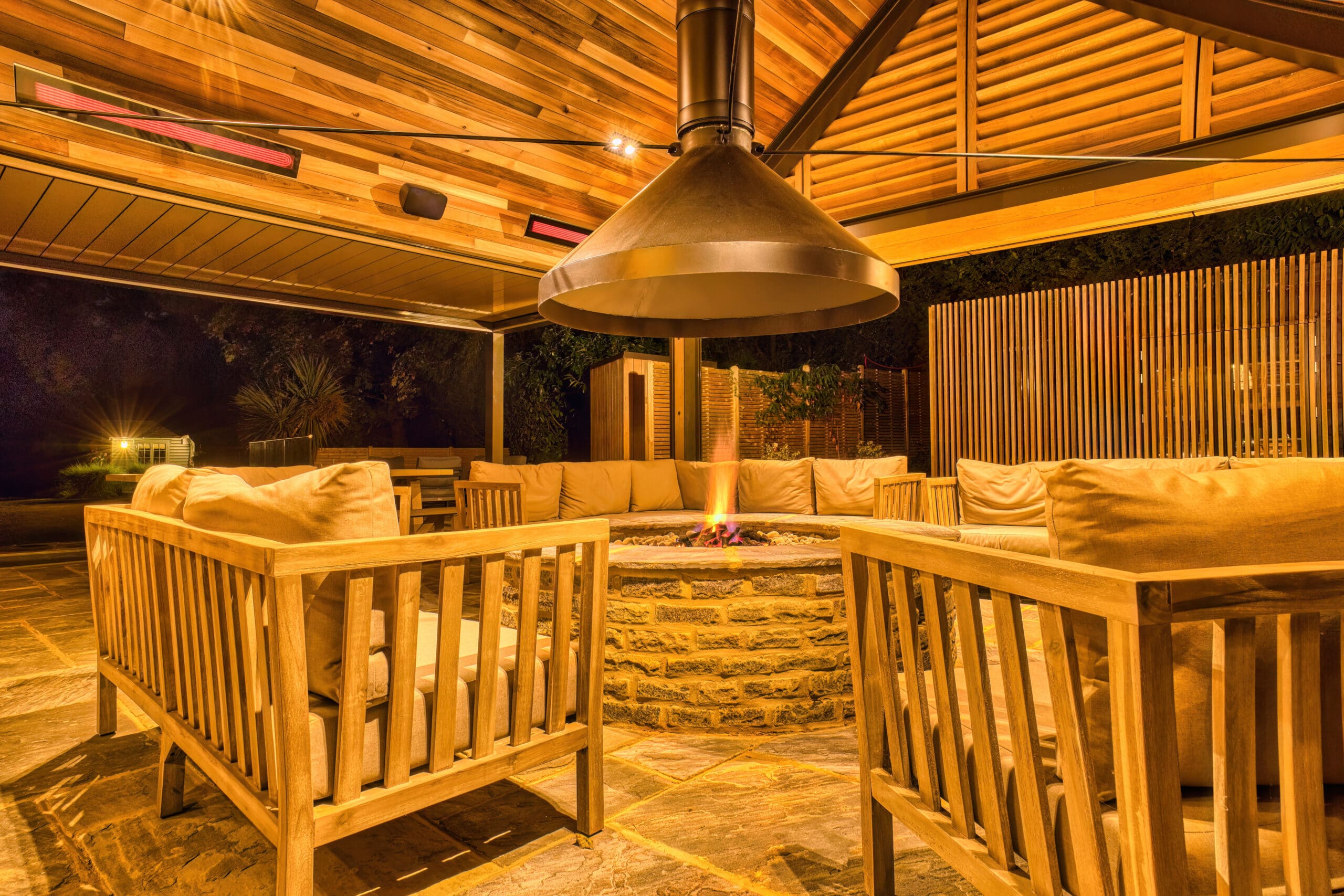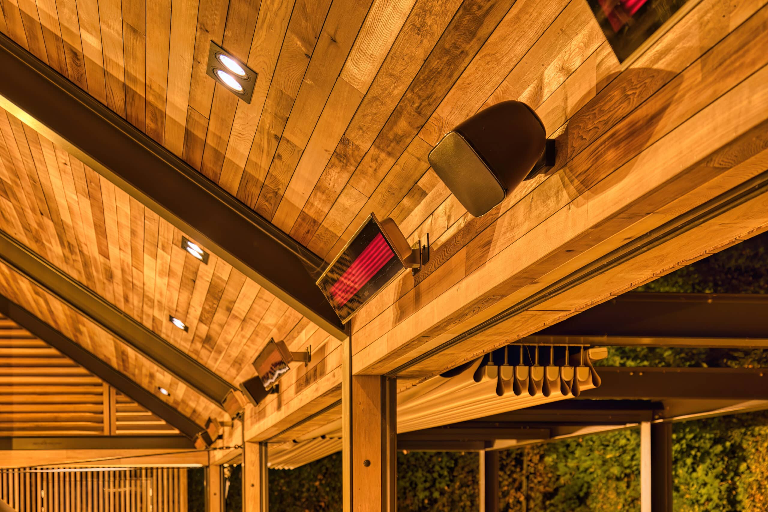 “We used to have open element style heaters before which look ugly, tend to rust, and get covered in cobwebs,” says Peters. “We wanted to be able to utilize the space year-round and use the heaters when the weather gets cooler.” The recommended black Bromic Platinum heaters were the perfect heating solution for this project, bringing dimension to the building, while giving the proper heat coverage to keep the space warm for the typical Southern England climate.
