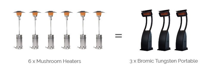 Les chauffages portables durent environ 9 heures avec un seul réservoir de 9 kg de GPL, en fonction de la puissance du chauffage (généralement entre 30 et 40 MJ). Si l’on considère qu’un réservoir coûte environ 30 $ par recharge, les avantages financiers d’un portable bromique en tungstène s’additionnent rapidement ! Par exemple, un pub et un restaurant qui ont actuellement 6 chauffages à champignons installés, pourraient économiser environ 45 $ par jour, en supposant qu’un réservoir de propane dure environ 2 services de dîner.