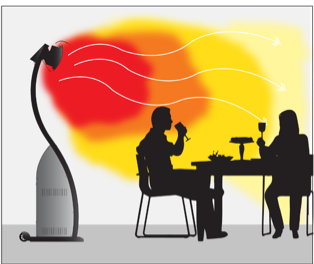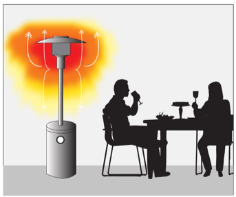 a) CHALEUR CONVENTIONNELLE : Les chauffages extérieurs conventionnels émettent de l’air chaud qui se mélange à l’air ambiant, ce qui leur permet d’augmenter la température moyenne d’une zone. Ainsi, ils réchauffent non seulement les personnes, mais aussi l’air qui les entoure, ce qui les rend très inefficaces puisque la majorité de la chaleur est dissipée, ce qui entraîne un gaspillage d’énergie.